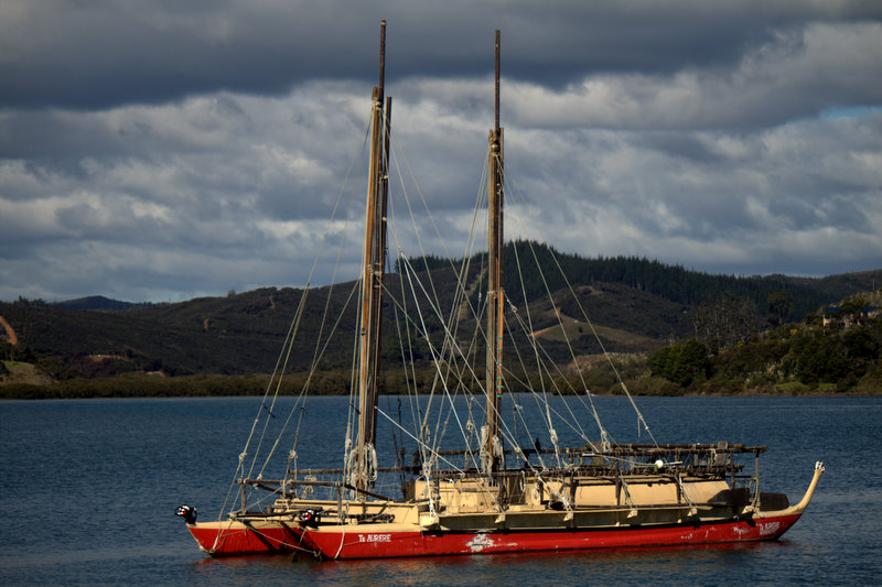 This was an extremely interesting discovery — looks like a modern replica of a voyaging canoe, of which many have now been built all over Polynesia. We asked a guy sitting in a car if he knew whose boat it was and he said he thought it came from Whangarei. Looks like something we’ll have to investigate….