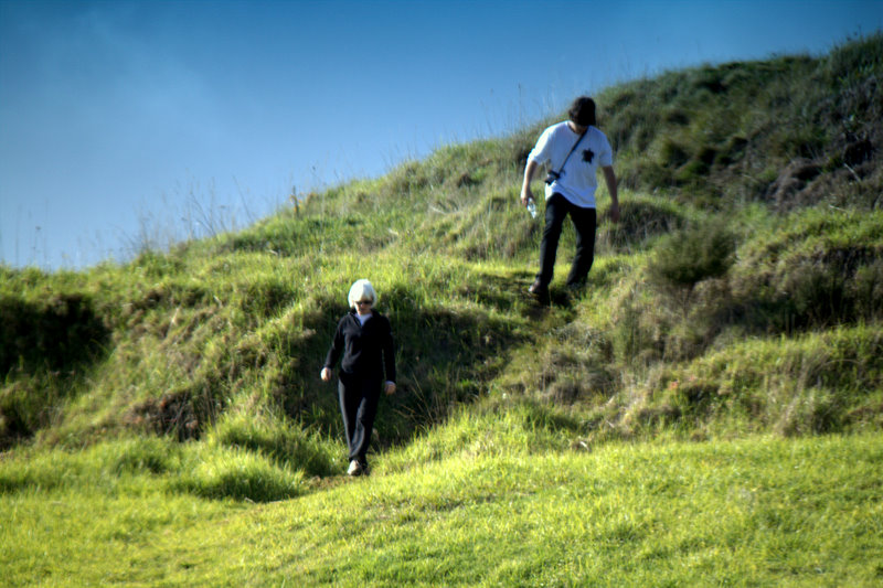 Pa are fortified villages which, in the old days, were built on prominent hilltops and headlands where you could get a really clear view of the surrounding countryside and not be taken by surprise by your enemies. The upper parts were terraced and fortified with ditches and palisades and even fighting stages; there are terrific descriptions of them in Cook’s journals (see also Elsdon Best). These days — except for the ones that have been reconstructed for tourists — they are just terraced hills, but even so they are pretty astonishing — the sense of power you have up on top, the commanding views, the magnitude of the terracing. Dani thought it was fantastic and spent the next few days nagging us about going back. Eventually we took him to One Tree Hill in Auckland, which is also pretty impressive.